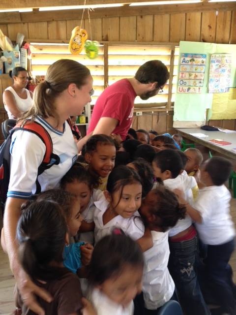 Jill and Jon receiving a loving welcome from the students in Porvenir